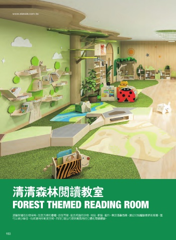 www.atakids.com.tw 清清森林阅读教室 FOREST THEMED READING ROOM 溫馨舒適的沙發座椅,取放方便的書櫃,造型可愛、配色和諧的沙發、地毯、軟墊、配件,營造溫馨氛圍。讓幼兒能體驗柔軟的感覺,還 可以減少噪音。有效運用多維度空間,共同打造出可愛萌趣風格的立體化閱讀體驗。 103