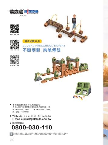 教具設備,搜尋"華森葳" 32 专注幼教 年 GLOBAL PRESCHOOL EXPERT 不断创新 突破传统 臉書粉絲專頁 LINE線上客服 華森葳國際教育用品有限公司 地 址:33373桃園市龜山區忠義路三段215巷15號 電 話:0 3-3978680 傳 真:03-3978666 統一編號:70477409 www.atakids.com.tw 2025/09