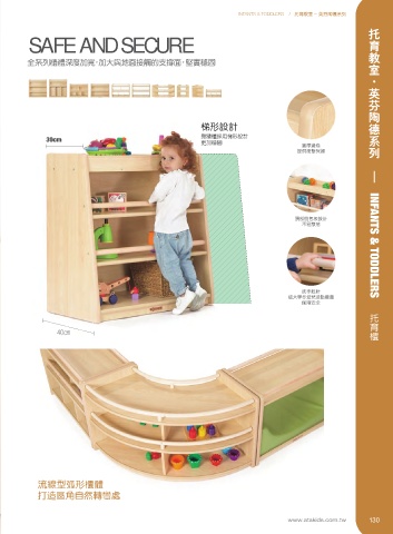 INFANTS & TODDLERS / 托育教室 - 英芬陶德系列 托育教室·英芬陶德系列 SAFE AND SECURE 全系列櫃體深度加寬,加大與地面接觸的支撐面,堅實穩固 梯形设计 30cm 靠牆櫃採用梯形設計 更加穩固 圆厚边条 提供冲击保护 — 顶部侧包板设计 不易散落 INFANTS & TODDLERS 扶手设计 扩大学步幼儿活动范围 托育柜 保障安全 40cm 流線型弧形柜体 打造区角自然转弯处 www.atakids.com.tw 130