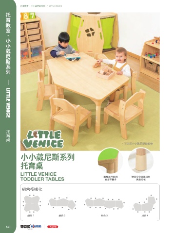 托育教室 - 小小葳尼斯系列 / LITTLE VENICE 托育教室·小小葳尼斯系列 — LITTLE VENICE 托育桌 * 不供應小小葳尼斯幼教椅 小小葳尼斯系列 托育桌 LITTLE VENICE TODDLER TABLES 边缘菱角圆润 優质安全塑胶腳套 保护地板 安全不伤手 组合多样化 组合 1 组合 2 组合 3 组合 4 149 专注幼教