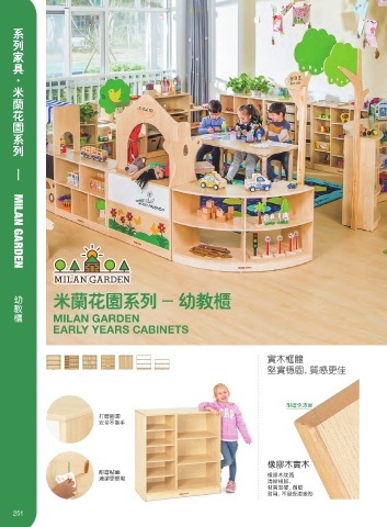 系列家具·米兰花园系列 — MILAN GARDEN 幼教柜 米兰花园系列 - 幼教柜 MILAN GARDEN EARLY YEARS CABINETS 实木框体 坚实稳固,质感更佳 耐磨免漆面 打磨圆润 安全不伤手 橡胶木实木 耐磨贴面 橡胶木纹路 清洁更轻鬆 清晰细腻, 材质坚硬,耐磨 耐用,不易受潮变形 251