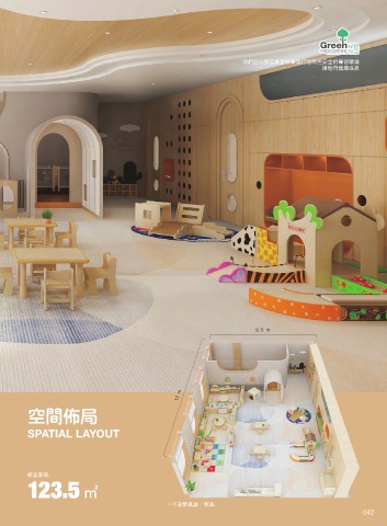 我们匠心致志为全球学童打造绿色安全的学习环境 让他们健康成长 9.5 m 13 m 空间佈局 SPATIAL LAYOUT 教室面积: 123.5 ㎡ * 不含教具盒 / 教具 042