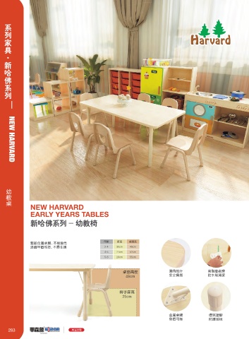 新哈佛系列 / NEW HARVARD 系列家具·新哈佛系列 — NEW HARVARD 幼教桌 NEW HARVARD EARLY YEARS TABLES 新哈佛系列 - 幼教椅 坚固金属桌脚,不易变色 年龄 座高 桌面高 漆面牢固性好,不易生锈 3-4 25cm 49cm 4-5 27cm 52cm 5-6 29cm 55cm 桌面高度 圆角设计 高耐磨处理 49cm 安全保护 防水易清洁 椅子座高 25cm 金属桌腿 优质塑胶 坚固可靠 防护地板 283 28 3 专注幼教