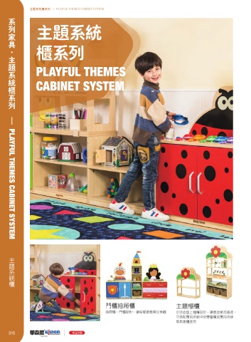 主题系统柜系列 / PLAYFUL THEMES CABINET SYSTEM 系列家具·主题系统柜系列 主题系统 柜系列 PLAYFUL THEMES CABINET SYSTEM — PLAYFUL THEMES CABINET SYSTEM 主題系統櫃 門櫃抽屜櫃 主題棚櫃 抽屜櫃,門櫃設計,讓空間更整潔又美觀 中空造型上棚櫃設計,讓教室更加通透; 可搭配萬用系統中空雙層櫃或萬用系統 教具盒櫃使用 315 专注幼教