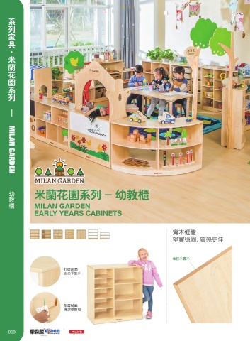 系列家具·米兰花园系列 — MILAN GARDEN 幼教柜 米兰花园系列 - 幼教柜 MILAN GARDEN EARLY YEARS CABINETS 实木框体 坚实稳固,质感更佳 橡胶木实木 打磨圆润 安全不伤手 耐磨贴面 清洁更轻鬆 069 专注幼教