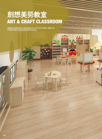 创想美劳教室 ART & CRAFT CLASSROOM 多种创意设备灵活组合,营造美劳教室色彩和功能的丰富性。简洁大气, 充满艺术氛围,启发幼儿的艺术想像与创造。 601