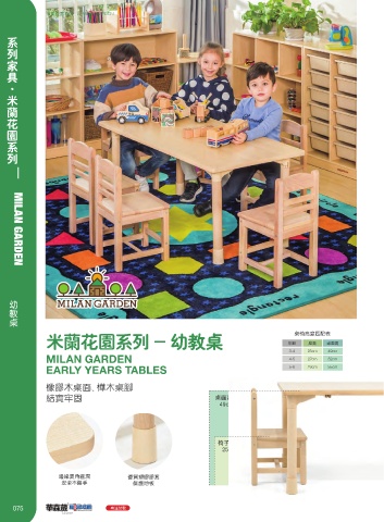 米兰花园系列 / MILAN GARDEN 系列家具·米兰花园系列 — MILAN GARDEN 幼教桌 米兰花园系列 - 幼教桌 年龄 桌椅高度匹配表 座高 桌面高 3-4 25cm 49cm MILAN GARDEN 4-5 27cm 52cm EARLY YEARS TABLES 5-6 29cm 55cm 橡胶木桌面、桦木桌腳 结实牢固 桌面高度 49cm 椅子座高 25cm 边缘菱角圆润 优质塑胶胶套 安全不伤手 保护地板 075 专注幼教