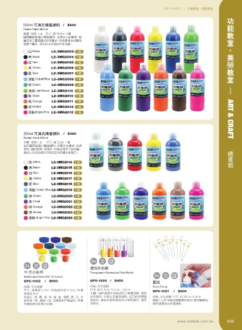 彩杯各 1 件,缤纷十色,加盖设计不易溢出,杯盖 身设计,让幼儿能够清楚地分辨各颜色,满足 搭配 2 公升可清洗绘画颜料使用,密封无间隙,