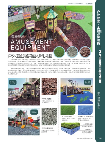 多樣選擇搭配童話情境;另外也有鬆填式鋪面,例如天然樹皮舖面與天然細礫石舖面,使用此類型鋪面材料之好處為較環保及具利於排水之